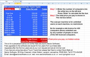 Site Licence: Contact us if you require educational establishment or site licence information for our typing tutor. We will be pleased to help. Alternatively you may download the Excel document below to work out licence costs. If you would like to speak to us about the site licence or to purchase a site licence: